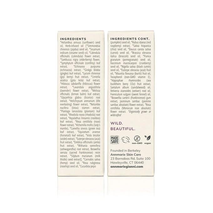 *Helianthus annuus (sunflower) seed oil, Herb-infused oil [*Simmondsia chinensis (jojoba) seed oil, *Sesamum indicum (sesame seed) oil, *Calendula officinalis (calendula) flower extract, *Sambucus nigra (elderberry) flower, *Symphytum officinale (comfrey) leaf extract, *Echinacea purpurea (echinacea) extract, *Ginkgo biloba (gingko) leaf extract, *Lycium chinense (goji berry) fruit extract, *Centella asiatica (gotu kola) leaf extract, *Hibiscus sabdariffa (hibiscus) flower extract, *Lavandula angustifolia (lavender) flower extract, *Melissa officinalis (lemon balm) leaf extract, *Glycyrrhiza glabra (licorice) root extract, *Helichrysum arenarium (life everlasting) flower extract, *Nelumbo nucifera (lotus) stamen extract, *Plantago lanceolata (plantain) leaf extract, *Rhodiola rosea (rhodiola) root extract, *Aspalathus linearnis (rooibos) leaf extract, *Rosa centifolia (rose) flower extract, *Alchemilla mollis (lady's mantle), *Camellia sinesis (green tea) leaf extract, *Equisetum arvense (horsetail) leaf extract, *Viola tricolor (violet) extract, *Euterpe oleracea (acai) fruit extract, *Emblica officinalis (amla) fruit extract, *Withania somnifera (ashwagandha) root extract, Boswellia serrata (sacred frankincense) resin extract, *Silybum marianum (milk thistle) seed extract], *Cannabis sativa (hemp) seed oil, *Rosa rubginosa (rosehip) seed oil, *Cucurbita pepo (pumpkin) seed oil, *Rubus idaeus (red raspberry) extract, *Salvia hispanica (chia) seed oil, *Daucus carota sativa (carrot) seed oil, *Brassica oleracea italica (broccoli) seed oil, *Punica granatum (pomegranate) seed oil, Vaccinium macrocarpon (cranberry) seed oil, *Nigella sativa (black cumin) seed oil, *Euterpe oleracea (acai) fruit oil, *Mauritia flexuosa (buriti) fruit oil, Tocopherol (non-GMO vitamin E), *Hippophae rhamnoides (sea buckthorn berry CO2) fruit extract, Santalum album (sandalwood) oil, Vetiveria zizanoides (vetiver) root oil, Foeniculum vulgare (sweet fennel) oil, *Boswellia carterii (frankincense) gum extract, Jasminum sambac (jasmine sambac absolute) flower extract, *Rosa centifolia (Moroccan rose absolute) flower extract. *Organically grown or wildcrafted