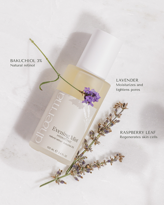 Lavandula Angustifolia (Lavender) Hydrosol Water, Rubus Idaeus (Raspberry Leaf) Hydrosol Water, Psoralea Corylifolia (Bakuchiol) Extract, Propanediol, Ethylhexyl Glycerin, Potassium Sorbate (to preserve).