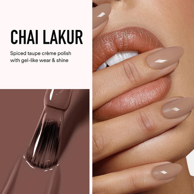 Chai lakur: Start with any kur base coat. Once the first layer has dried, apply 1-2 coats of lakur as needed. Let the polish dry for 10-15 seconds and seal with any kur top coat. To expedite the drying process, apply 1-2 drops of Accelerating Drying Oil at the cuticle and allow the oil to run to the free edge of the nail. For best results, reapply top coat every 3-4 days to lock in color and help extend wear time.