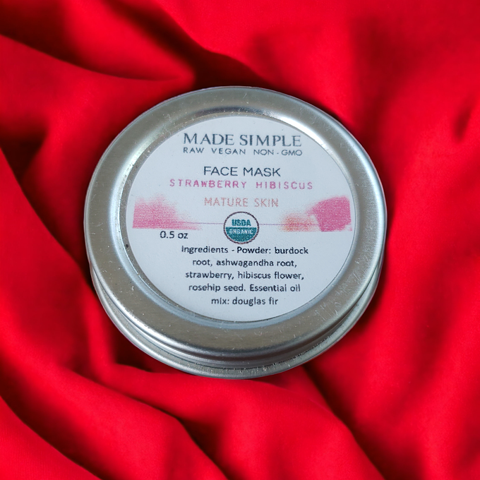 Our Strawberry Hibiscus Mask combines ashwagandha root powder and hisbiscus flower powder among other powders and essential oils as a gentle exfoliant to help diminish dark spots, blemishes, acne scarring and fine lines from your skin. Formulated for mature skin types, this mask helps in the shedding of dead skin cells while deeply nourishesing and regerating your skin with rosehip seed powder. Strawberry, rich in polyphenols and vitimin C, is soothing to the skin and helps reduce the appearance of pores. Incorporate this mask into your weekly skin regimen to achieve a smoother and brighter complexion.