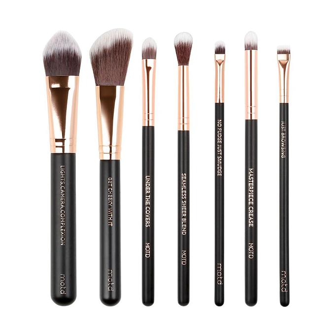 Elevate your looks with this 7-piece vegan face and eye makeup brush set. Dare to Begin Face and Eye Makeup Brush Set includes all the essential makeup brushes that are perfect for beginners looking to achieve a full face flawless makeup look. This set includes a blush vegan leather bag with rose gold hardware that is great to store your favorite products and take with you on the go.