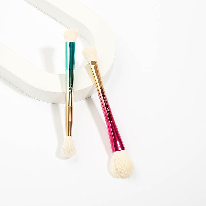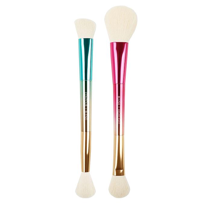 A dual ended versatile makeup brush set designed for your multi-tasking moments. Party of Two brush set helps you effortlessly apply an array of cream or powder products that includes blush, highlight, contour and more. Use these perfectly sized brushes for the most flawless finish.
