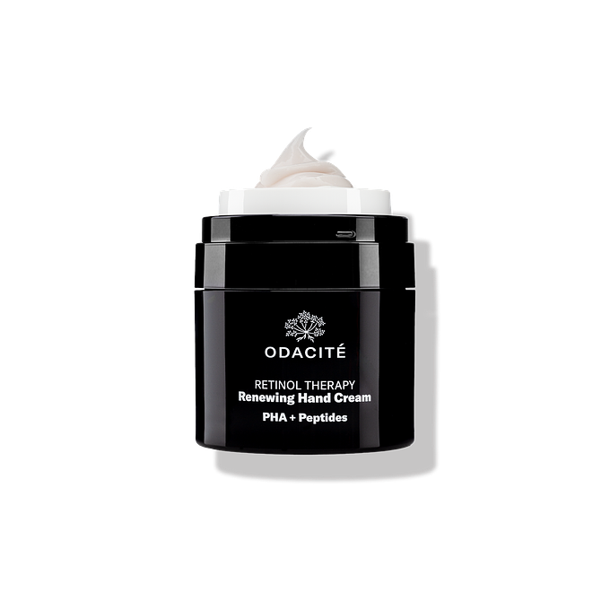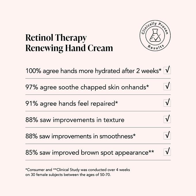 This advanced hand treatment pairs the regenerating power of Retinol & Retinoid with Polyhydroxy Acid (PHA), Peptides, and Niacinamide to deeply care for dry hands showing signs of aging, like crepey, thinning skin, dark spots, and damaged cuticles.