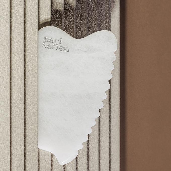 Pari Satiss Gua Sha White Stone is made from white jade. In Chinese culture, white jade is believed to heal the skin by absorbing and releasing toxins trapped in the face and body. It is also known to promote calmness in body and mind, bringing mental clarity and, hence, clearer skin.