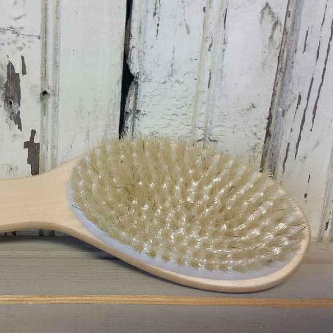 Starting at the outer most part of your body, like your hands and feet, use your Dry Brush to lightly brush your skin. Use small, circular motions as you brush towards your heart. Brush all over from neck down for best results. Use as often as once a day.