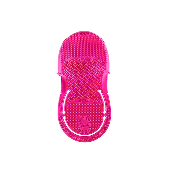 Place strap around thumb and wrist for a secure fit. Wet brush under warm, running water. Apply 1-3 pumps of SigMagic® Brushampoo™ Liquid or Foam directly onto brush fibers or WASH texture. Swirl brush on WASH texture, using Face textures for larger brushes and Eye textures for smaller brushes. Using warm water, sweep brush back and forth on RINSE texture to remove makeup and cleanser. Move brush up and down on REFINE texture to ensure all makeup is removed. Swirl brush on REFINE PLUS texture for an added clean. Add more brush cleanser and repeat steps 1-5 as needed. Gently squeeze brush bristles to remove excess water.