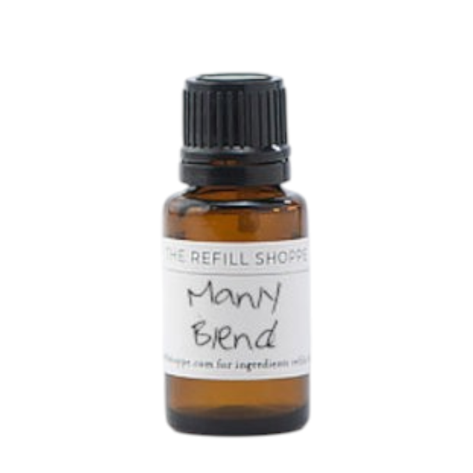 The Manly Blend is clean and rich, with a slight earthy sweetness. It's a well-balanced blend of grapefruit, lemon, lavender, fir needle, patchouli, hazelnut, and vanilla bean. Works really great in the beard oil!